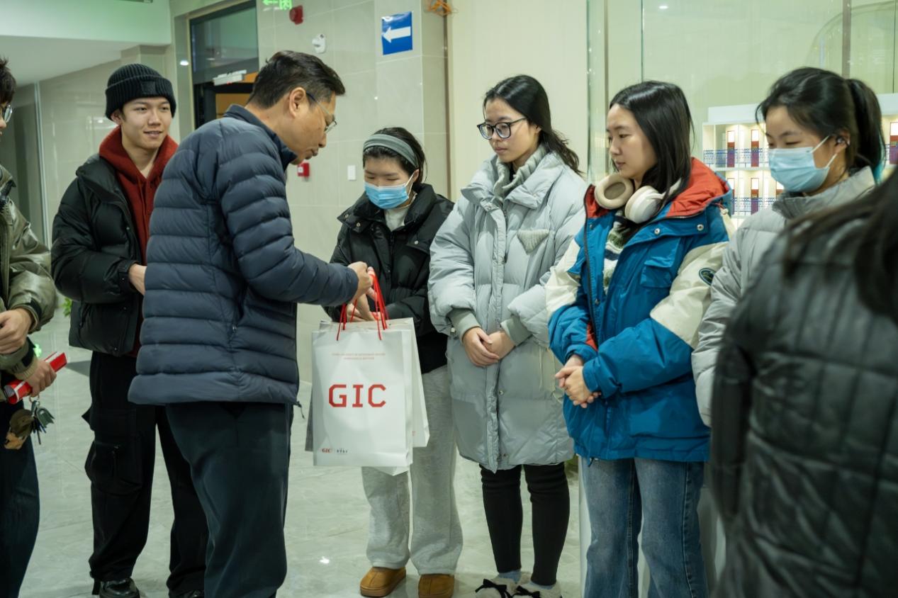 随行的老师们为每一位考研学子送上了精心准备的考研加油包。“考研加油包”内的五样物品分别寓意“心想事成”“平平安安”“暖意绵绵”“能量满满”和“难忘地大”,每一份都凝聚着学院的深切期盼,交谈在轻松的氛围中结束。